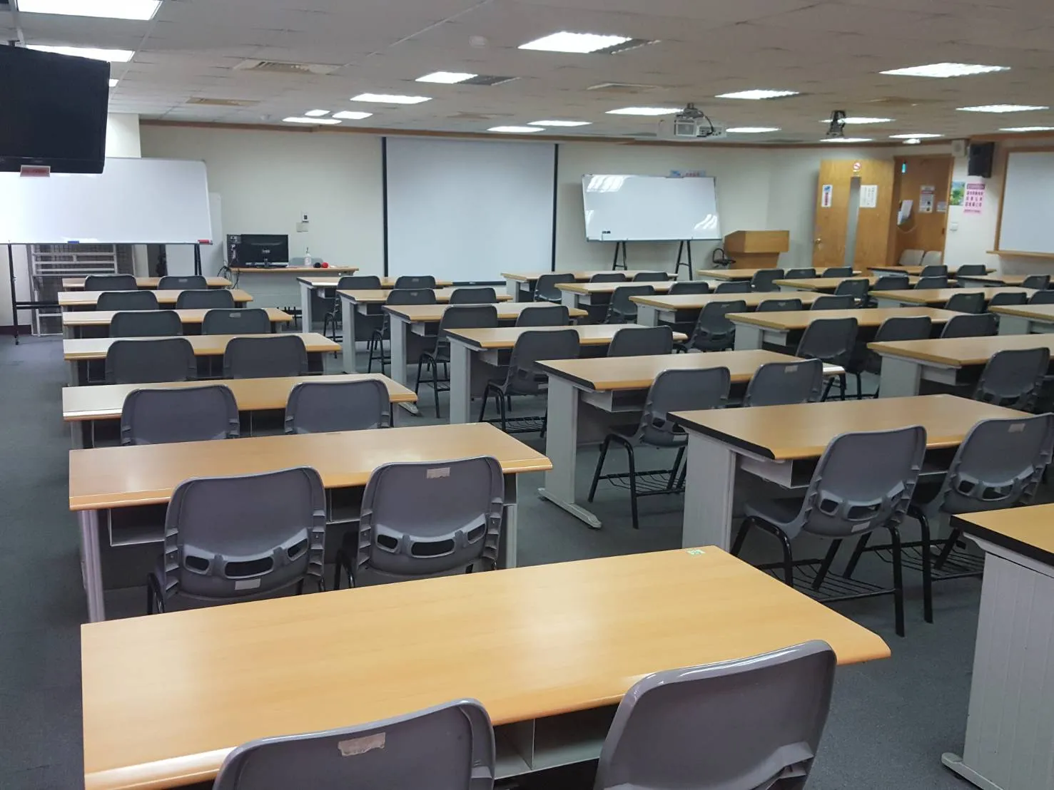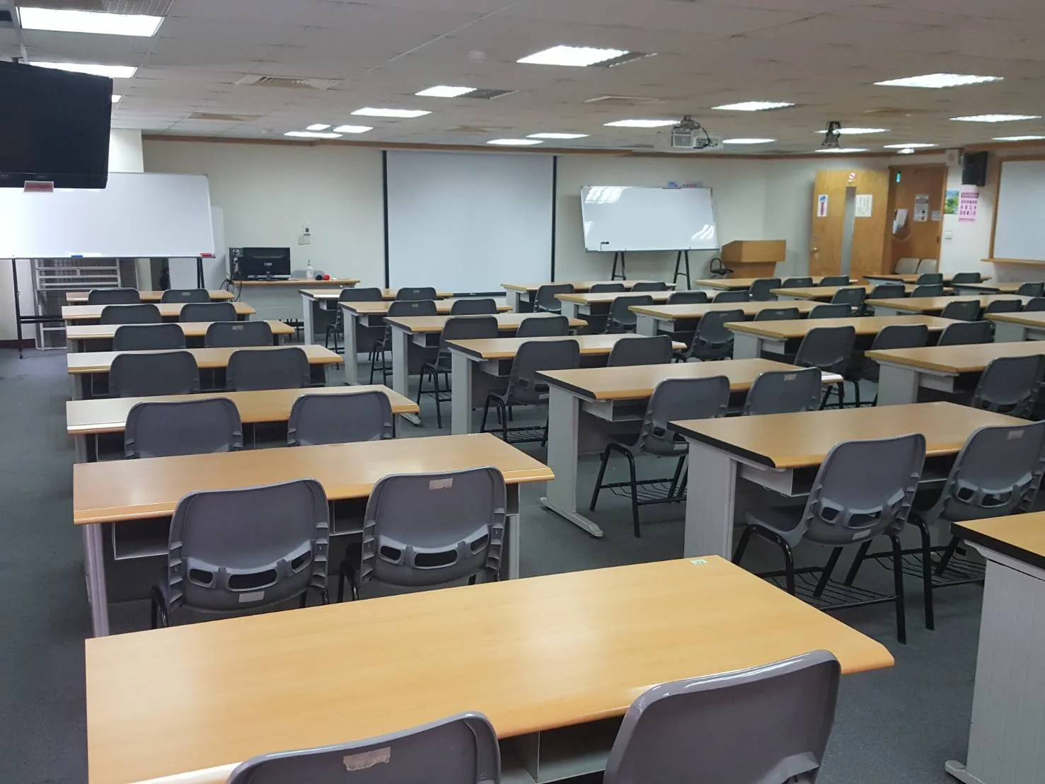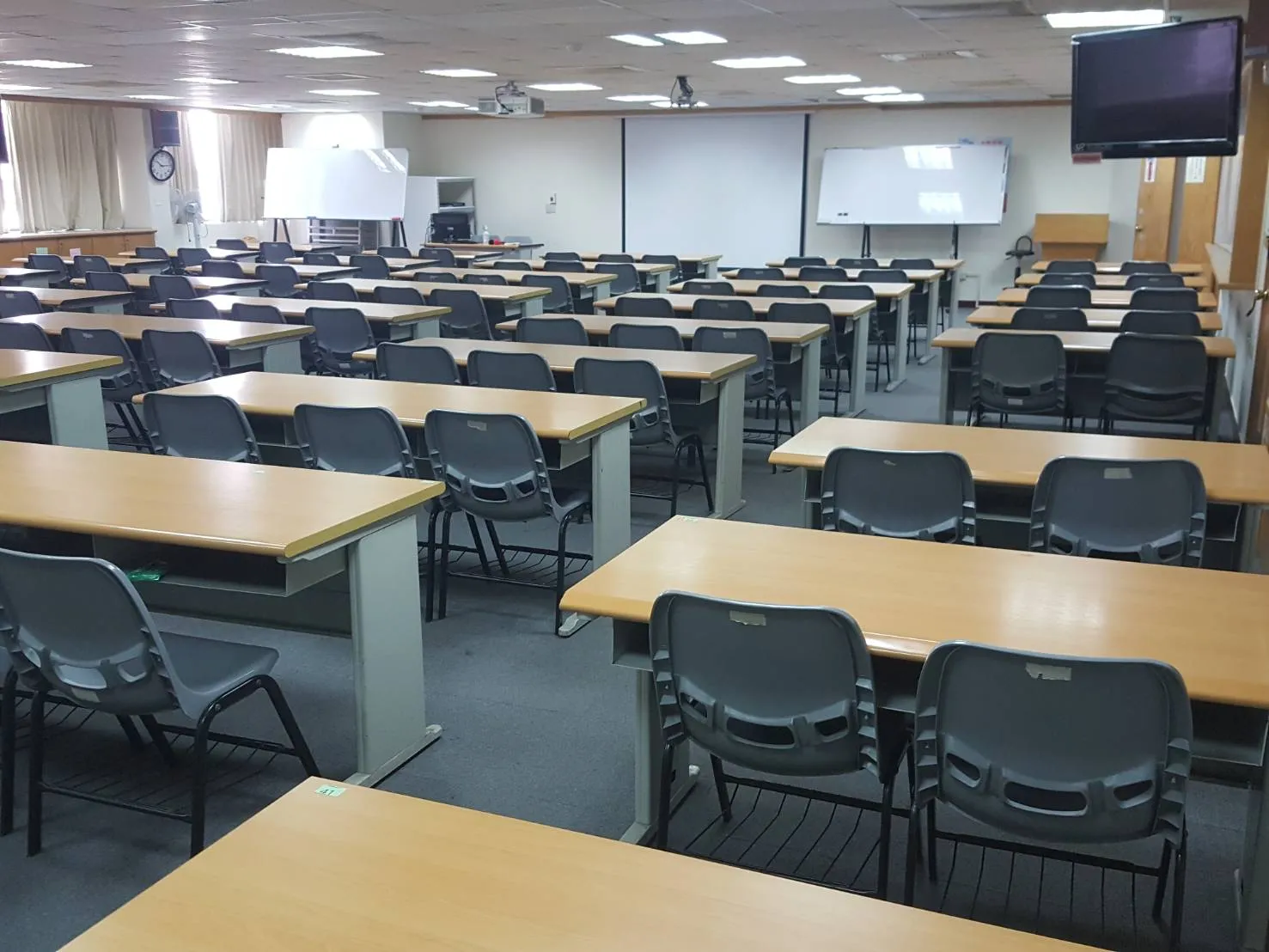 教室環境教室型態 - 大型教室教室空間可容納人數70~100人。 ▼教室型態: 上課型 設備說明電腦設備:教師電腦*1 單槍設備:投影布幕*1、投影單槍*1、液晶電視*2 音響設備:擴音設備*1、喇叭*4、無線麥克風*2