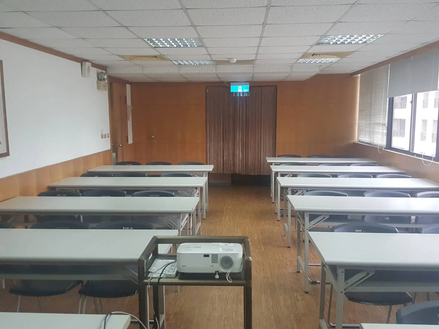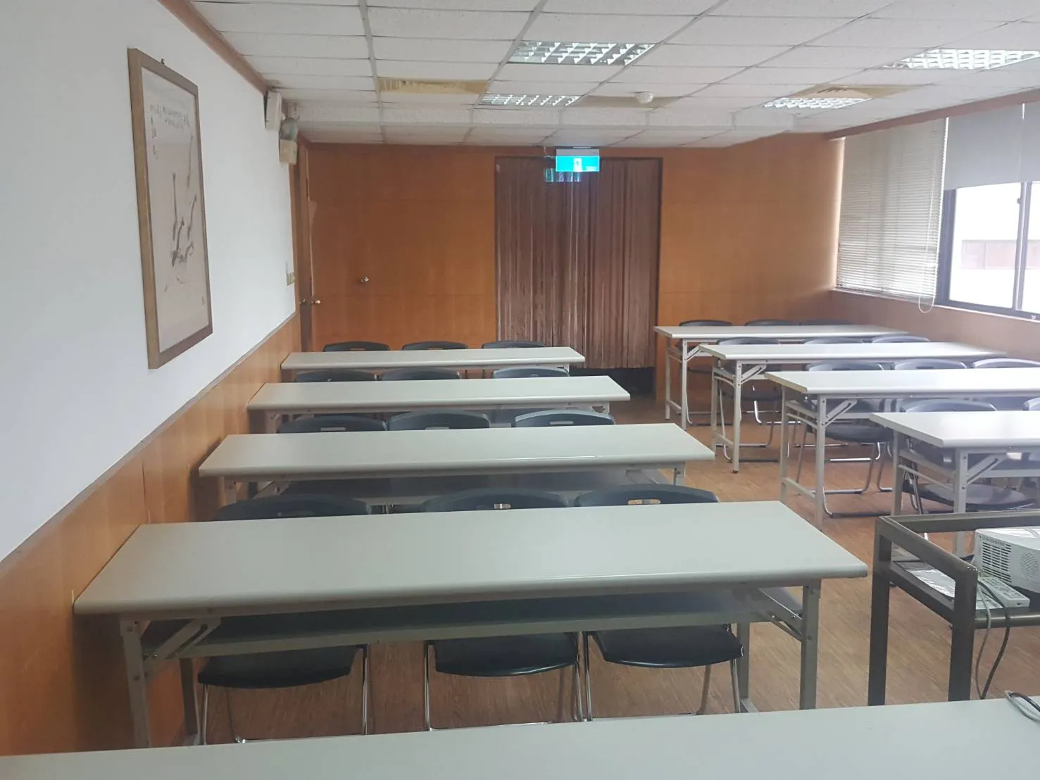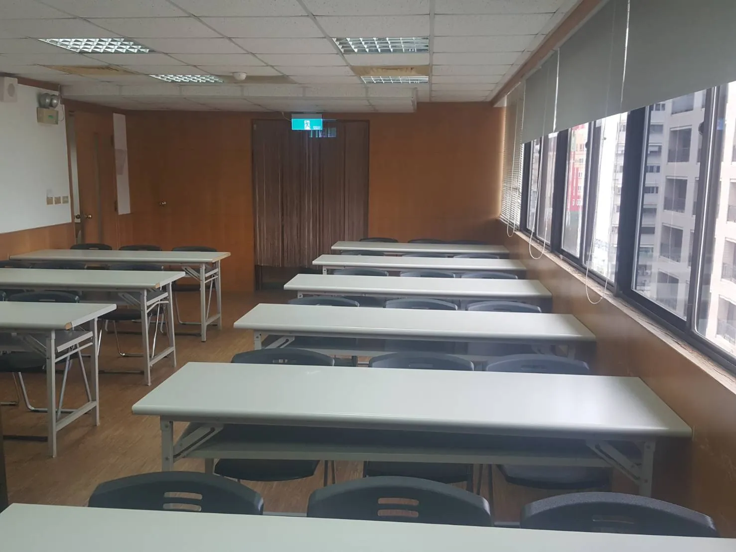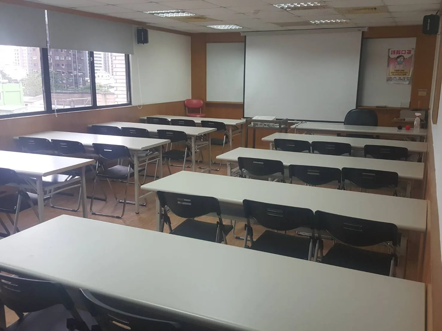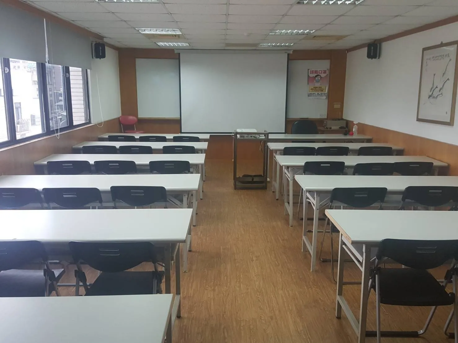 教室型態 - 小型教室教室空間可容納人數10~20人。 ▼教室型態: 上課型 | 會議型設備說明電腦設備:教師電腦*1 單槍設備:投影布幕*1、投影單槍*1 音響設備:擴音設備*1、喇叭*2、無線麥克風*2 白板設備:固定式白板*1