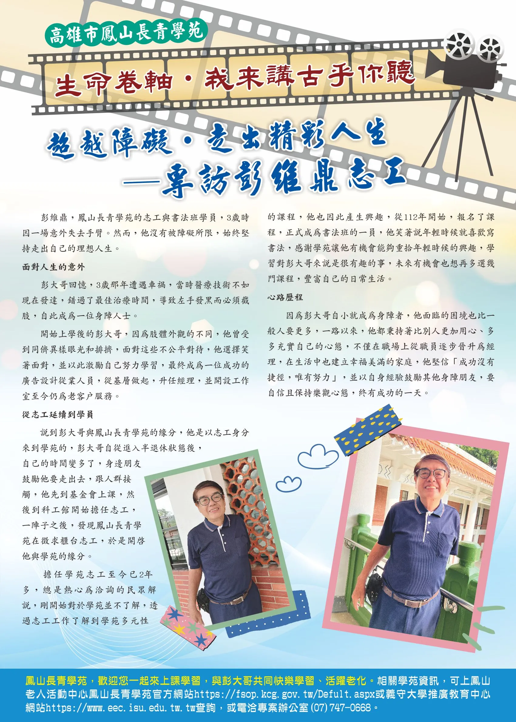 彭維鼎,鳳山長青學苑的志工與書法班學員,3歲時因一場意外失去手臂。然而,他沒有被障礙所限,始終堅持走出自己的理想人生。